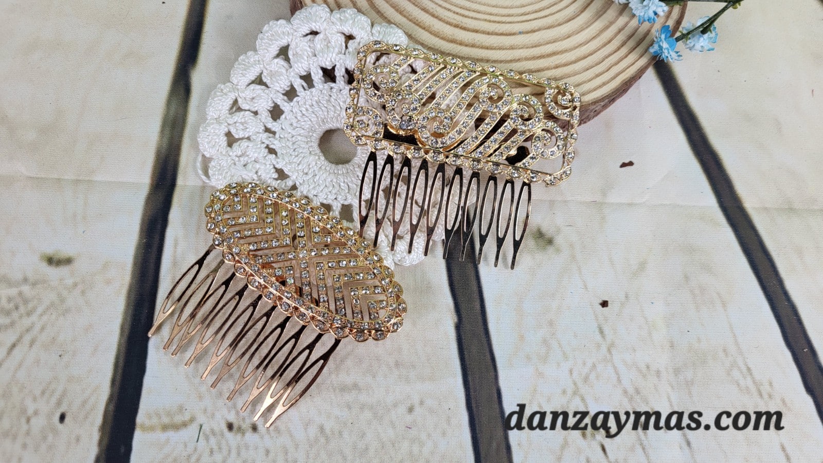 Peineta dorada con brillo. Dos modelos muy bonitos, elegantes y discretos pero con la gracia del brillo. Este modelo viene en dos versiones, una mas cuadrada y otra oval. Algo diferente para colocarlo en tus actuaciones de escenario ya que brillara con tus movimientos y se vera muy bonita.
