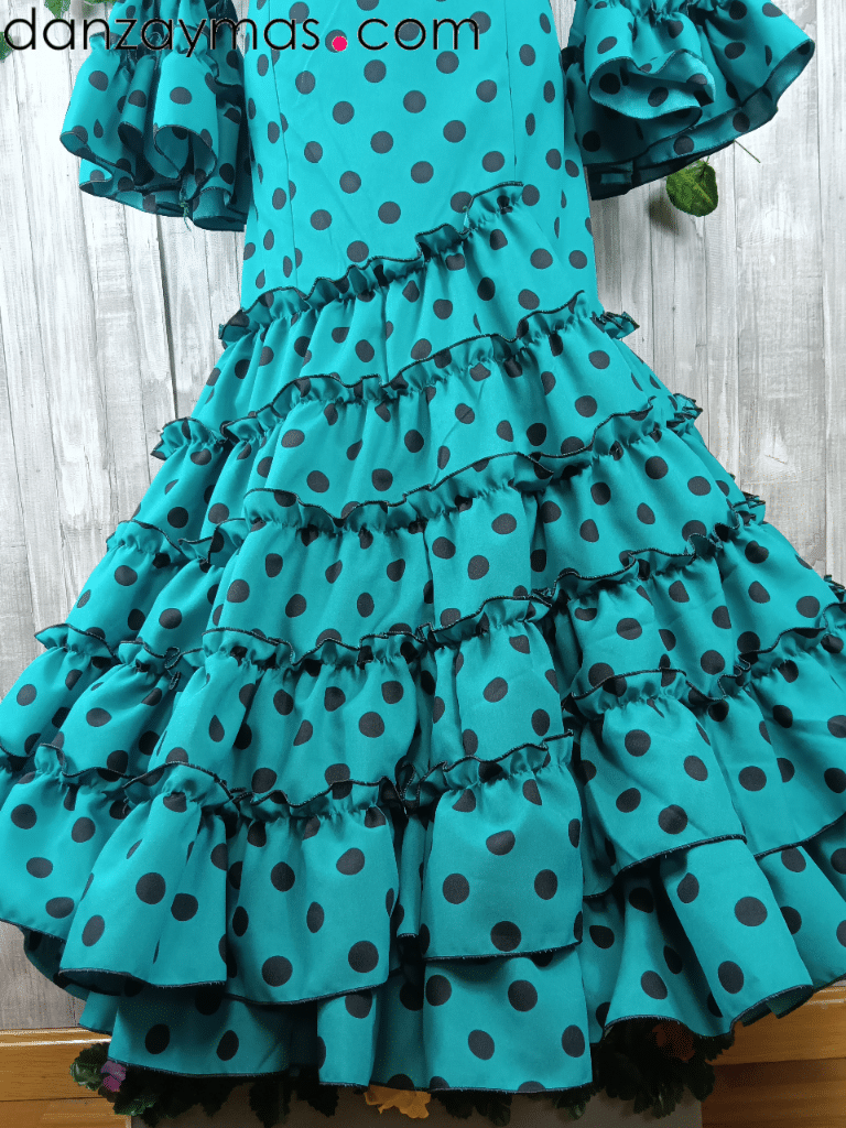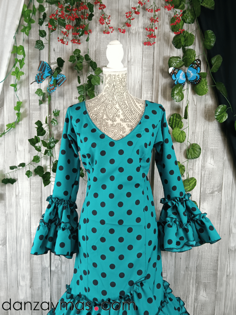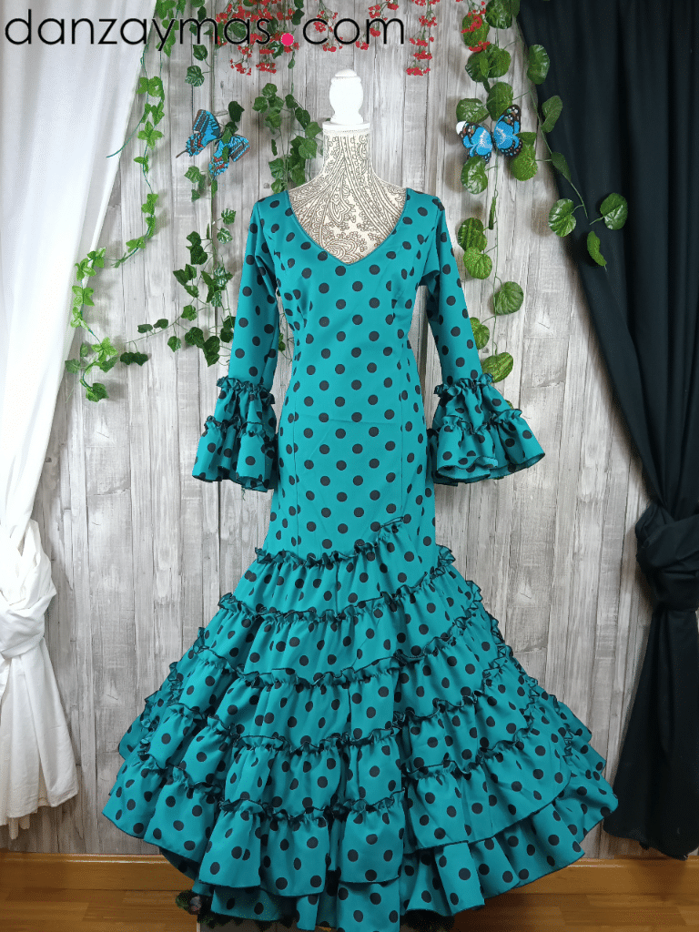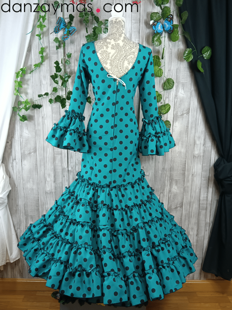 Traje flamenca señora. Espectacular traje flamenco con estampado de lunares a tono diferente del fondo pero en la misma. Su escote y espalda en pico realzará tu figura al igual que la manga al codo. Con volantes canasteros en la falda y garrucha termina de adornar tu cuerpo. Mira nuestros complementos de flamenca pinchando aquí.