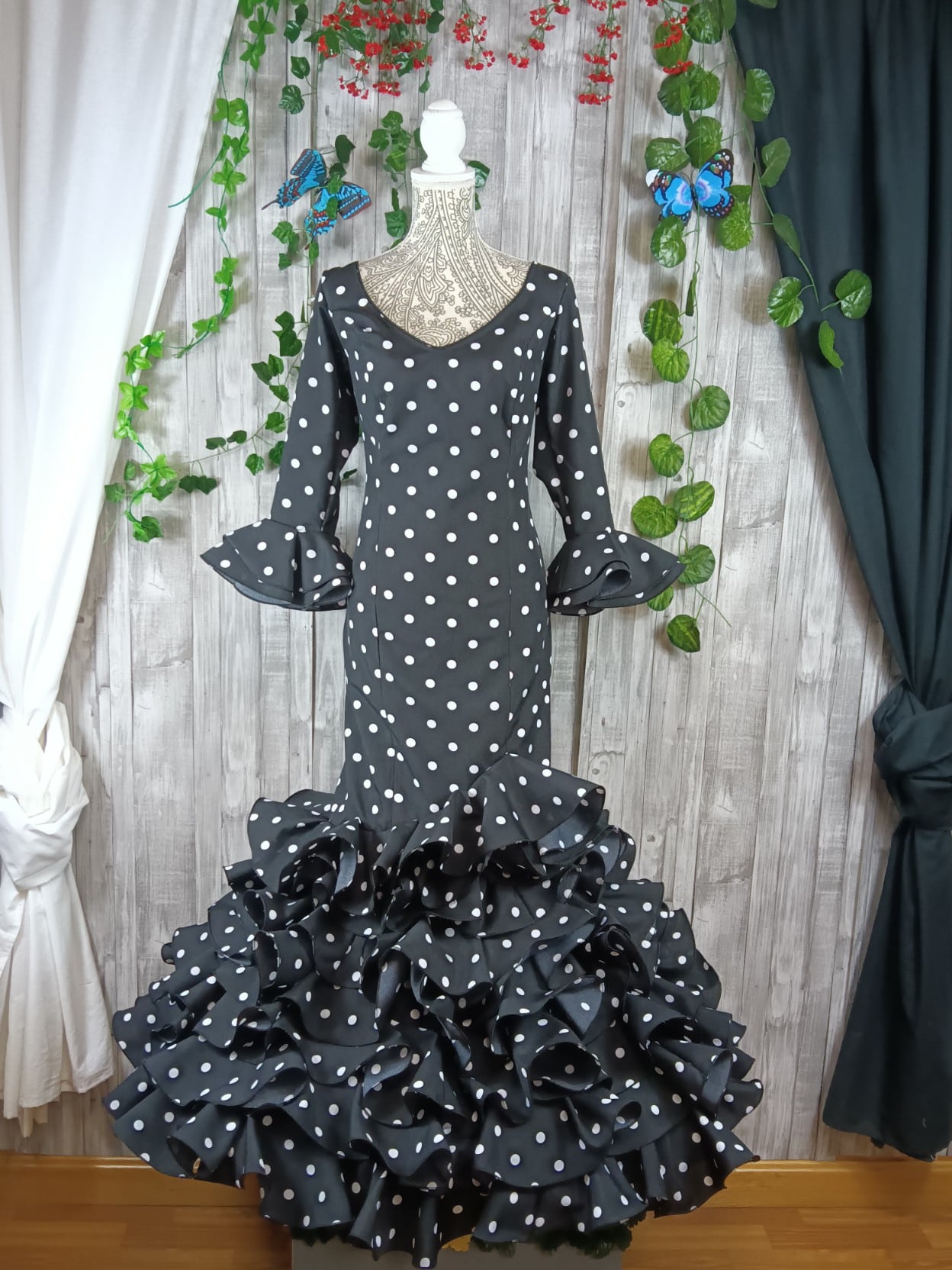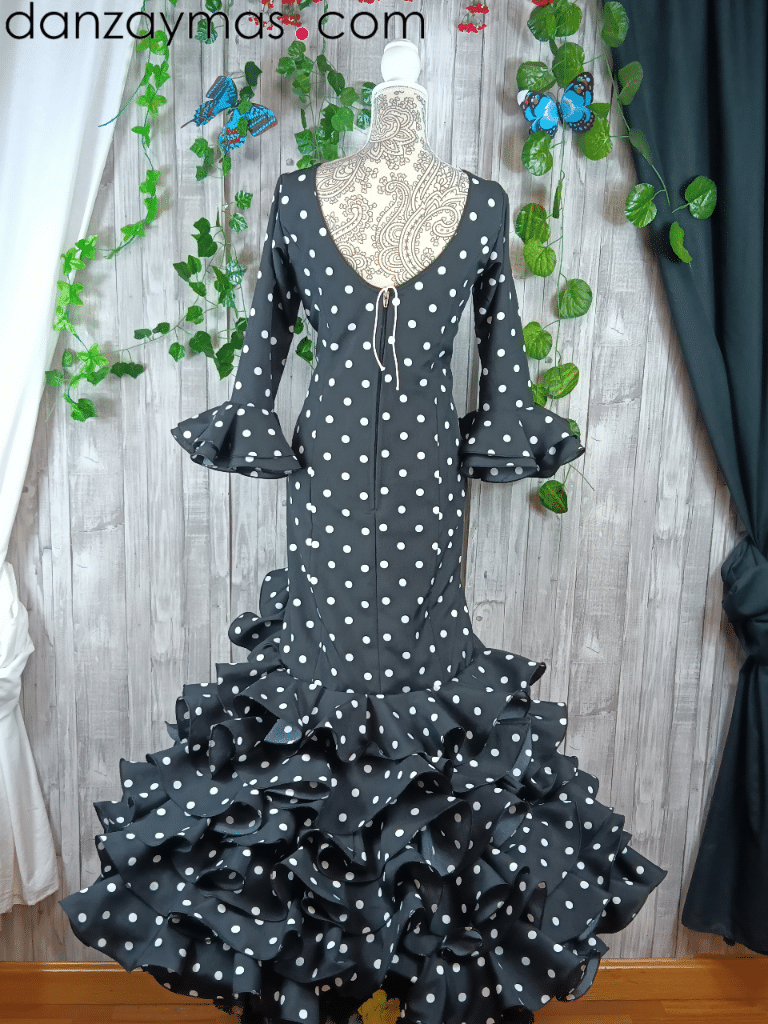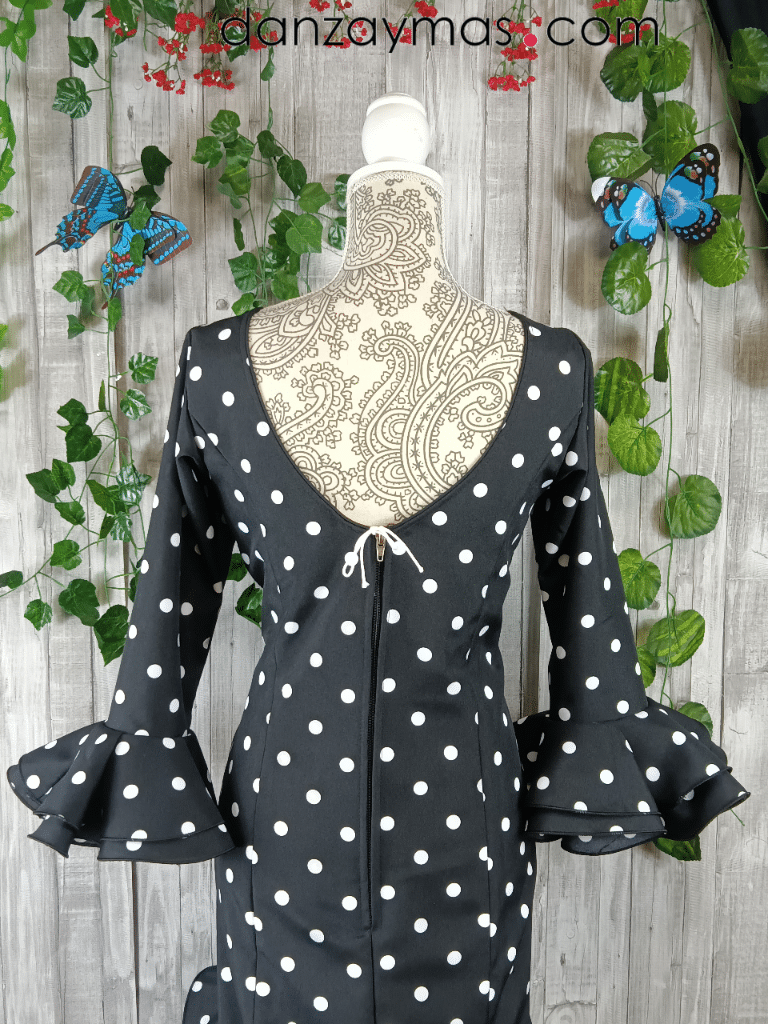 Traje negro lunar blanco. Clásico donde los haya pero importante como fondo de armario no crees? Un bonito vestido de flamenca con colores alegres para combinar con pendientes llamativos y flores de colores. Confeccionado en tejido strech y forrado interiormente en tejido de algodón para que arme todo el cuerpo. Sus mangas al codo terminan en dos volantes del mismo tejido y la falda va adornada con seis volantes al hilo de la rodilla. Escote y espalda en pico que favorece muchísimo.