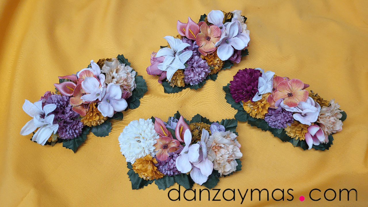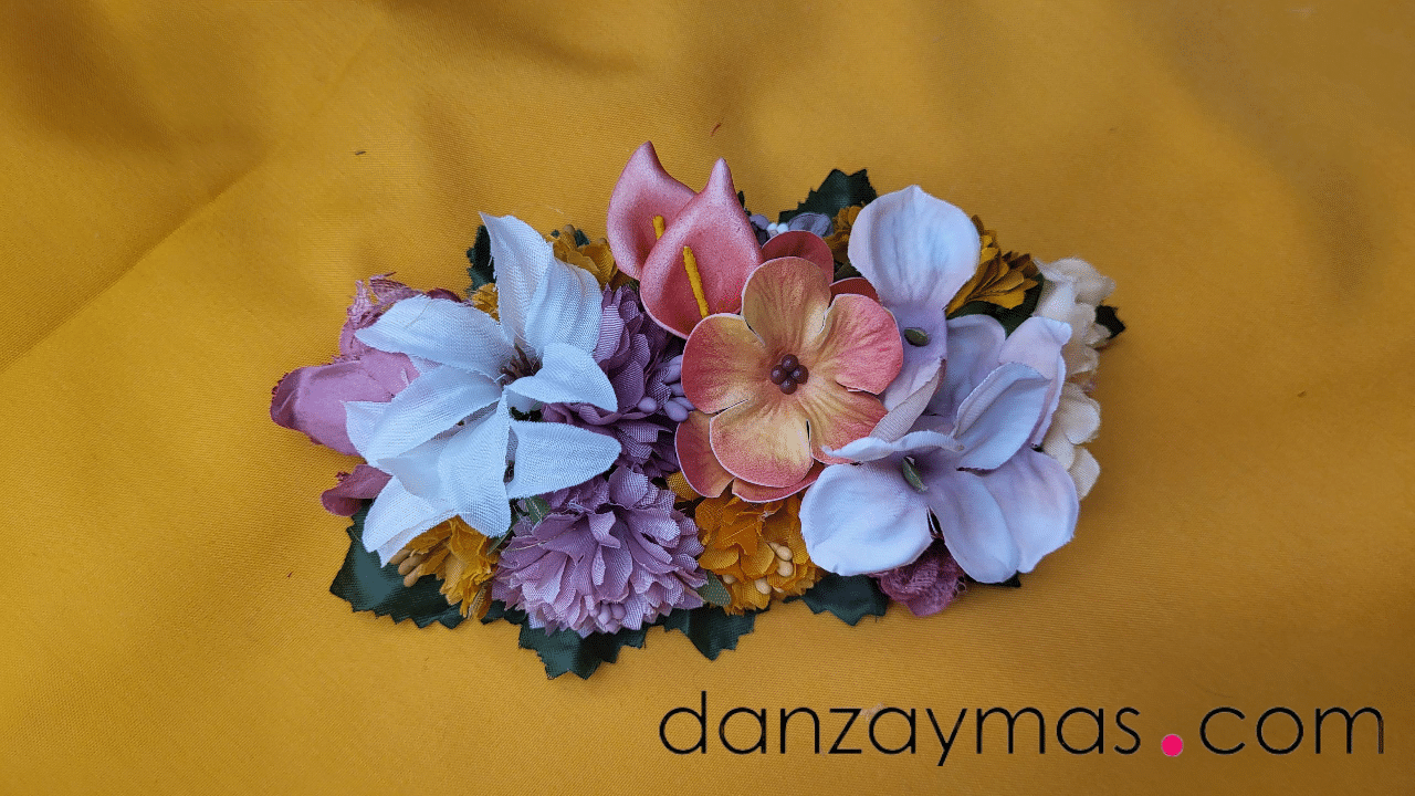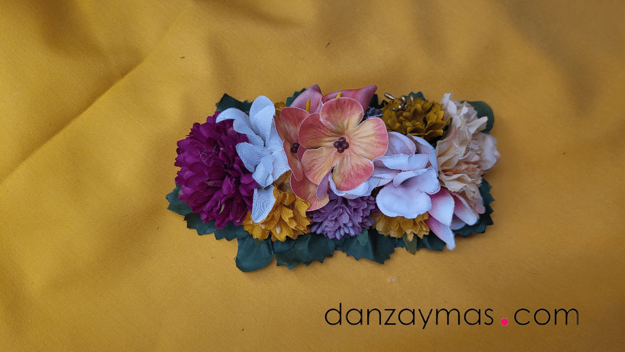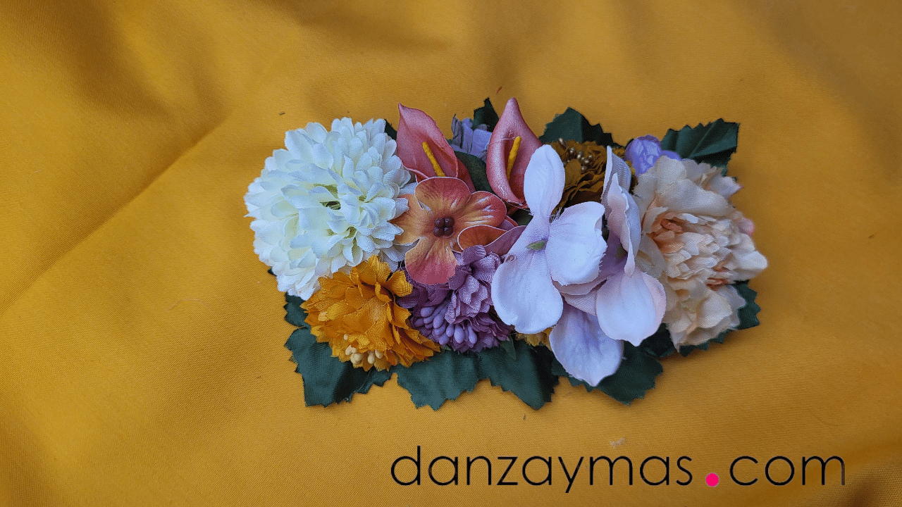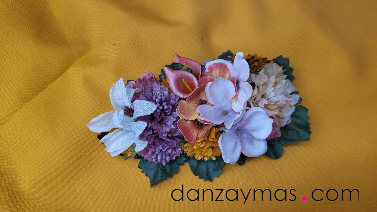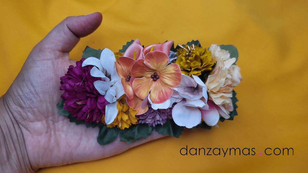 Todas la flores están pegadas a una base de hojas verdes con cuatro modelos diferentes de disposición para que elijas la que más te gusta. En la trasera del ramito le hemos puesto una pinza grande de metal para que no se mueva y no te complique la vida a la hora de colocártelo en el recogido o moño de huertana.