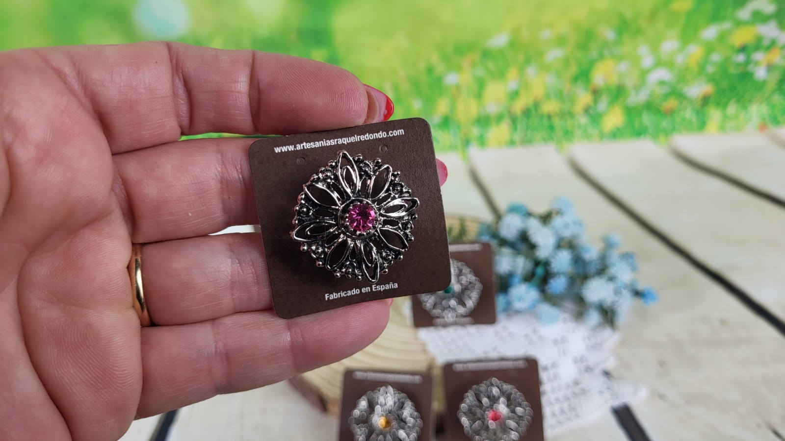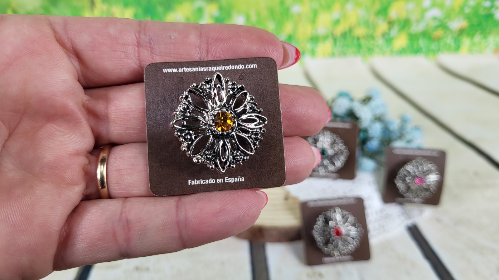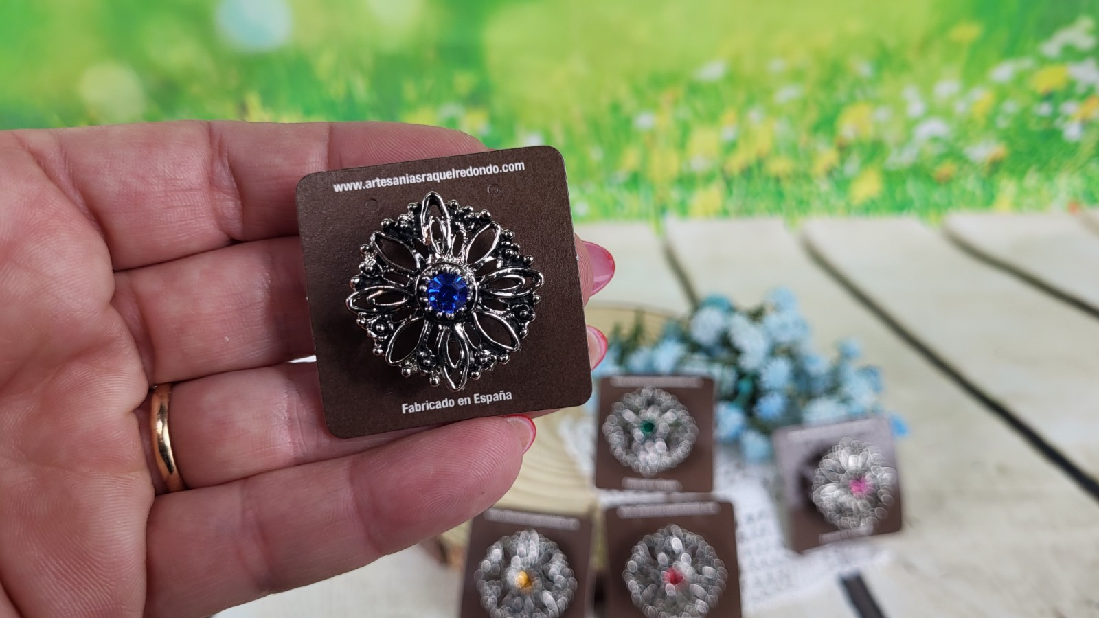 Broche huertano en plata oxidada en forma de flor con pétalos ondeados y una piedra de cristal de color y brillante. Un complemento indispensable para cualquier huertana. Este color de metal del broche podrás usarlo con cualquier color de refajo ya que combina con todos los colores.