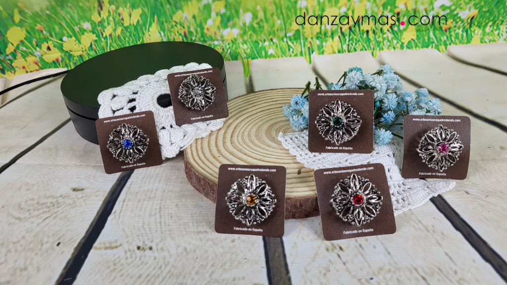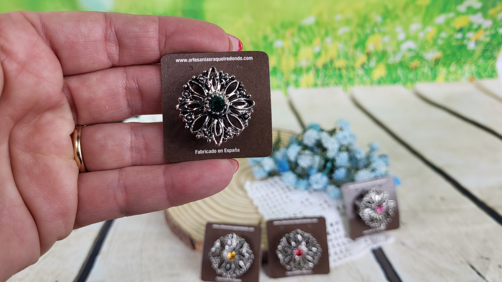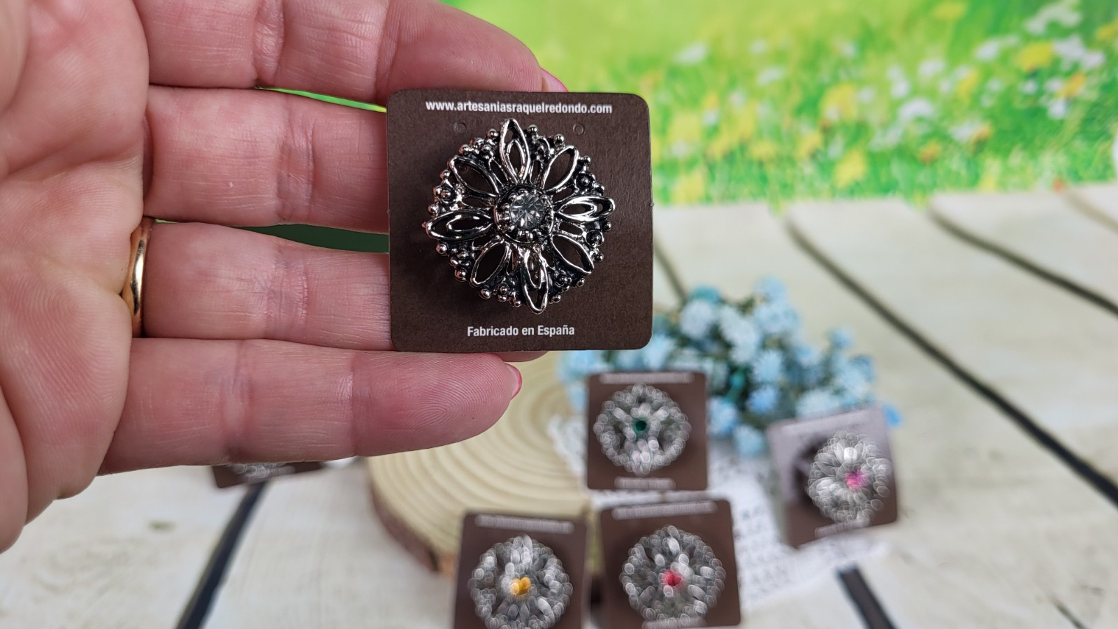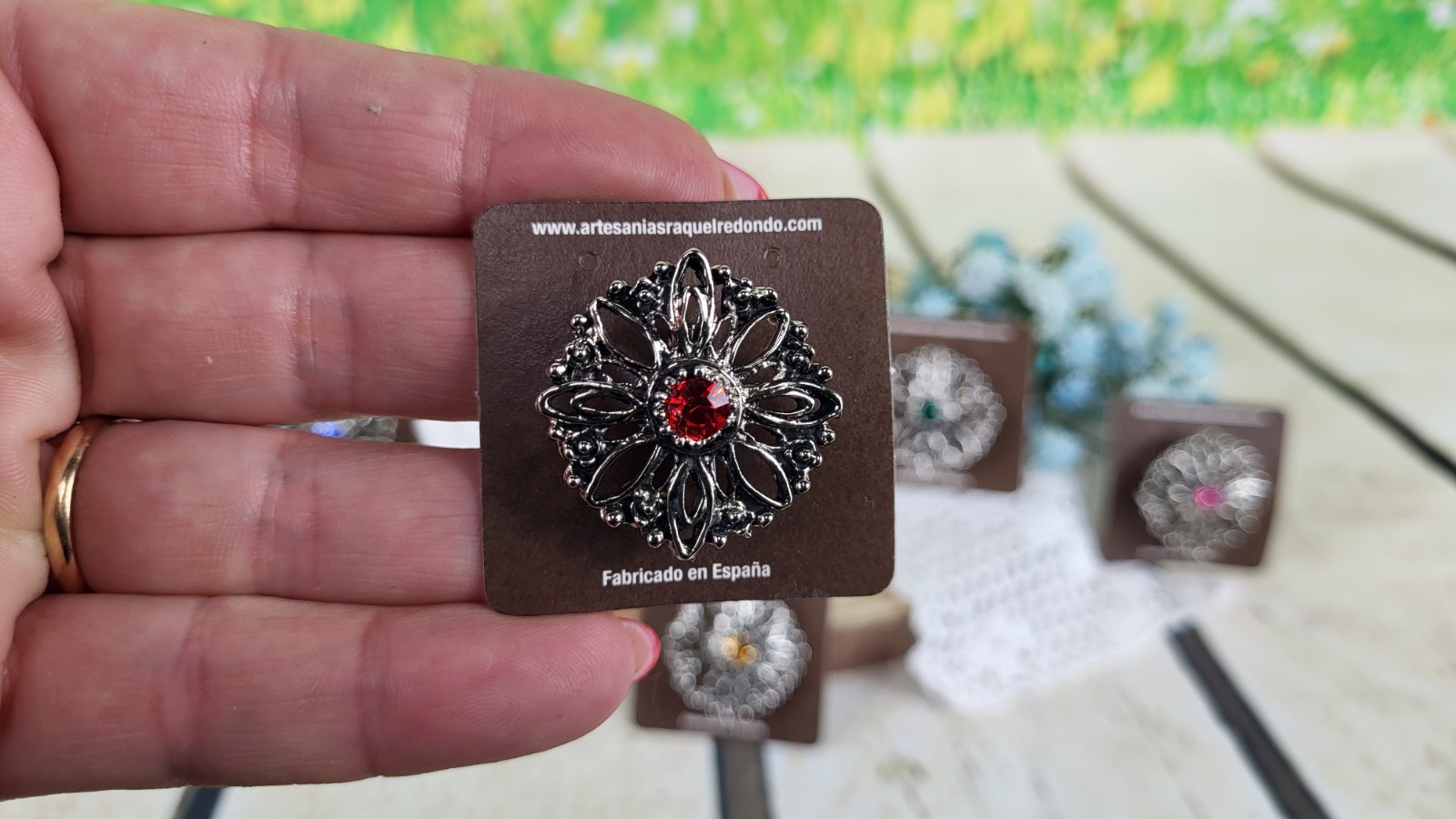 Broche huertano en plata oxidada en forma de flor con pétalos ondeados y una piedra de cristal de color y brillante. Un complemento indispensable para cualquier huertana. Este color de metal del broche podrás usarlo con cualquier color de refajo ya que combina con todos los colores.