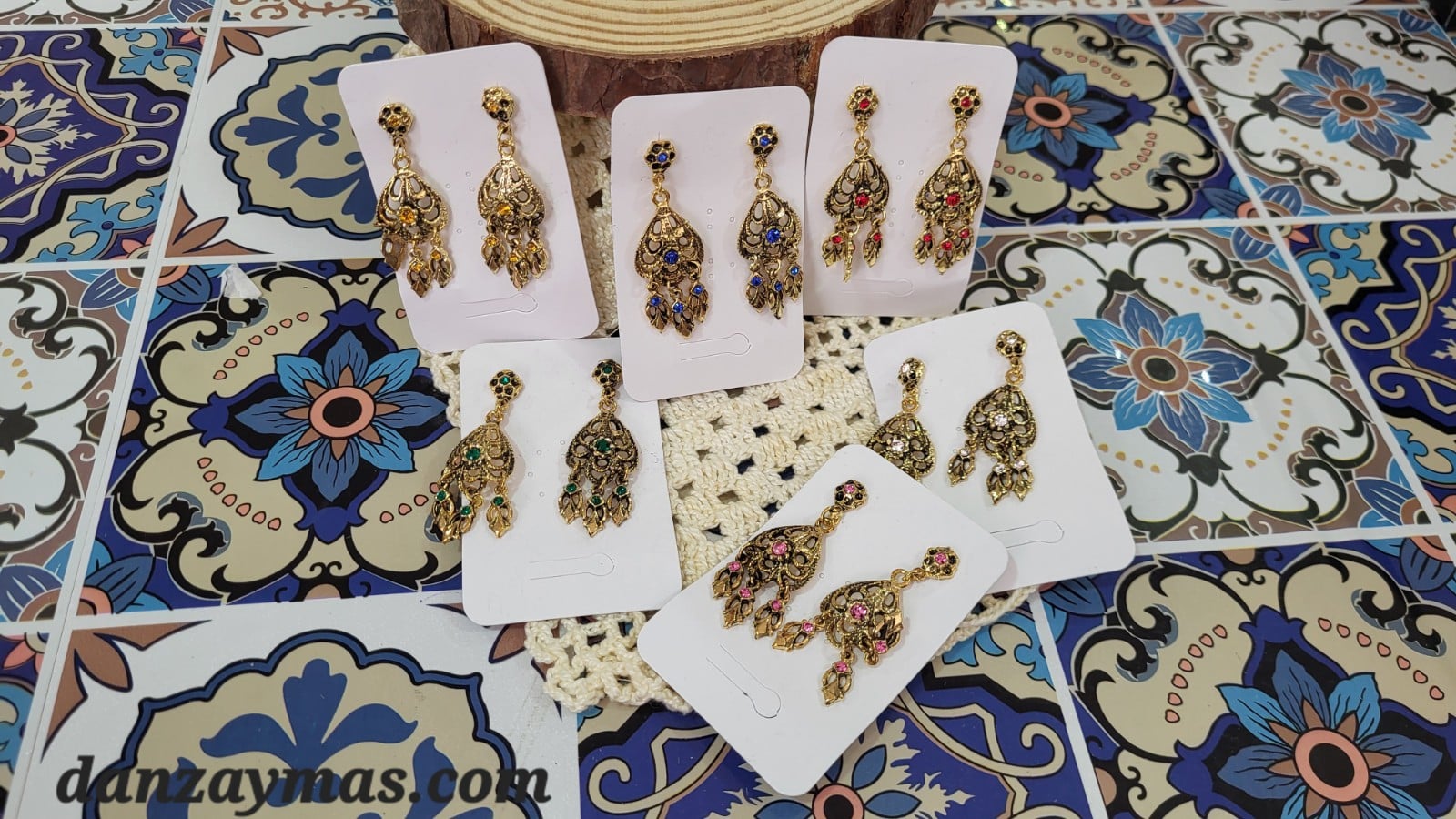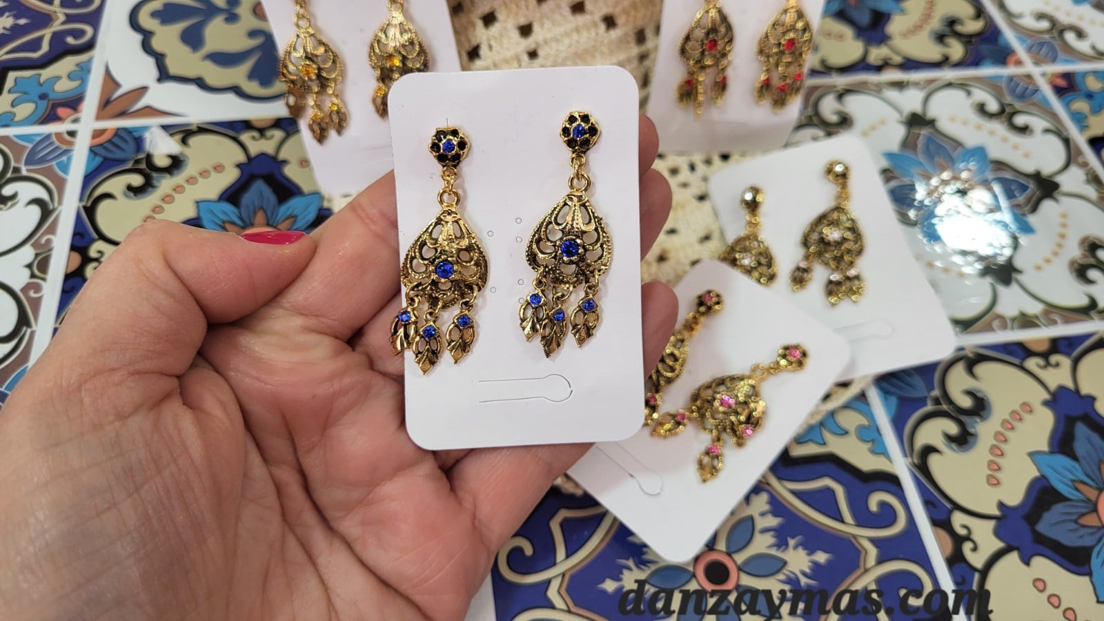 Pendientes dorados para el traje regional. Que preciosidad de pendientes!! La base que va en la oreja es de una forma en flor con su piedra de color. Una piedrecilla de color corona el colgante y tres péndulos con tres piedras termina de adornar la pieza.