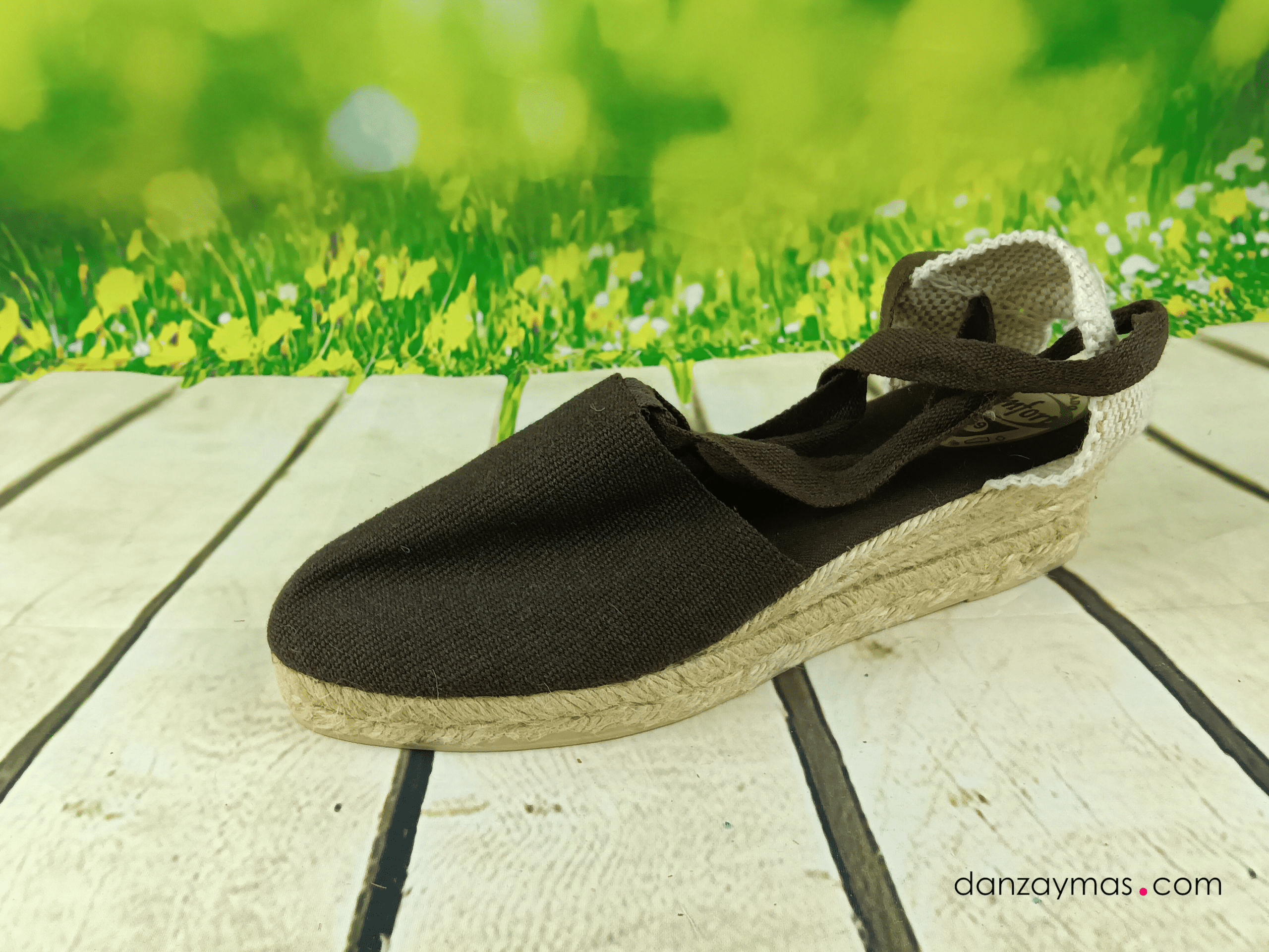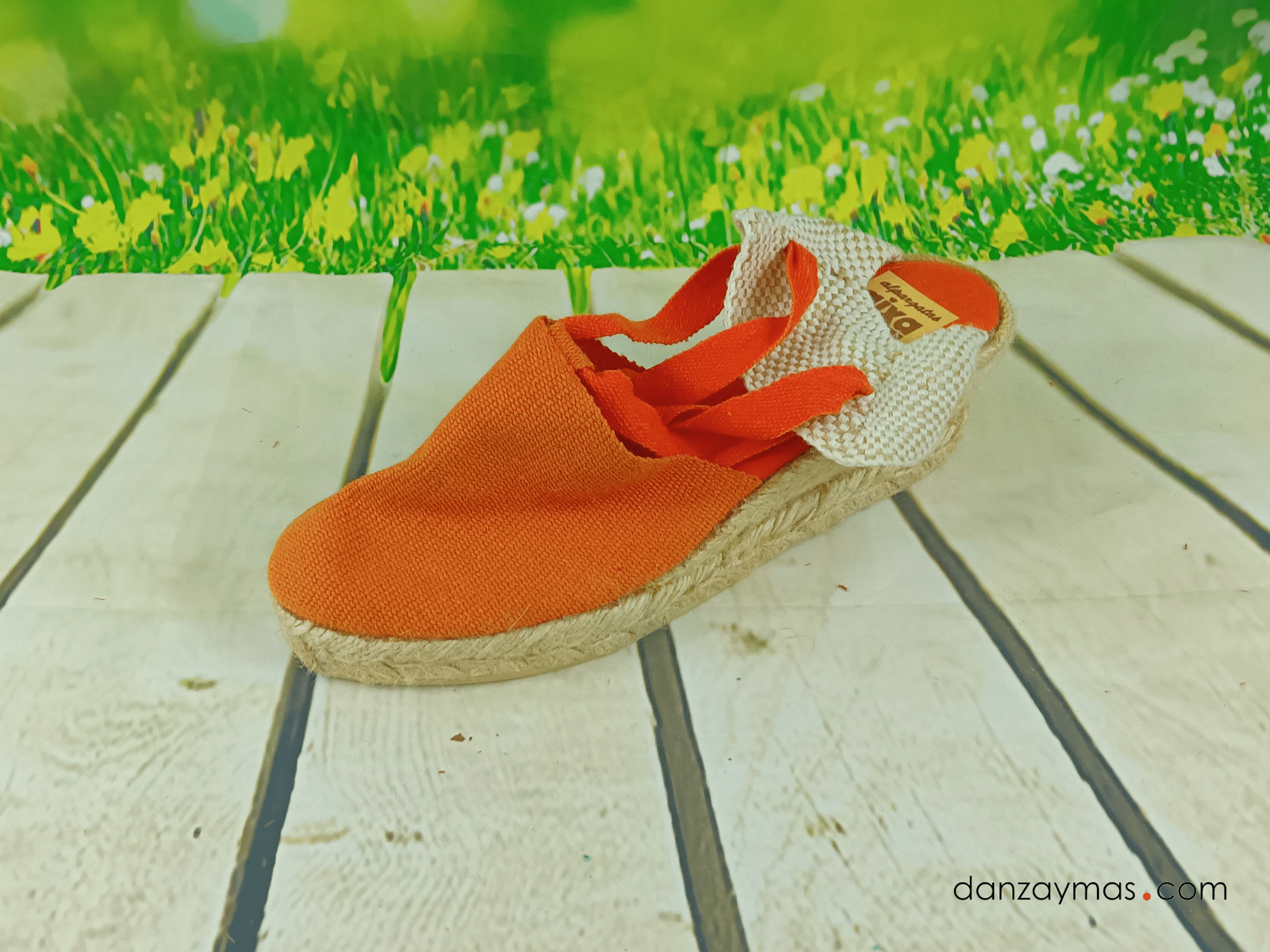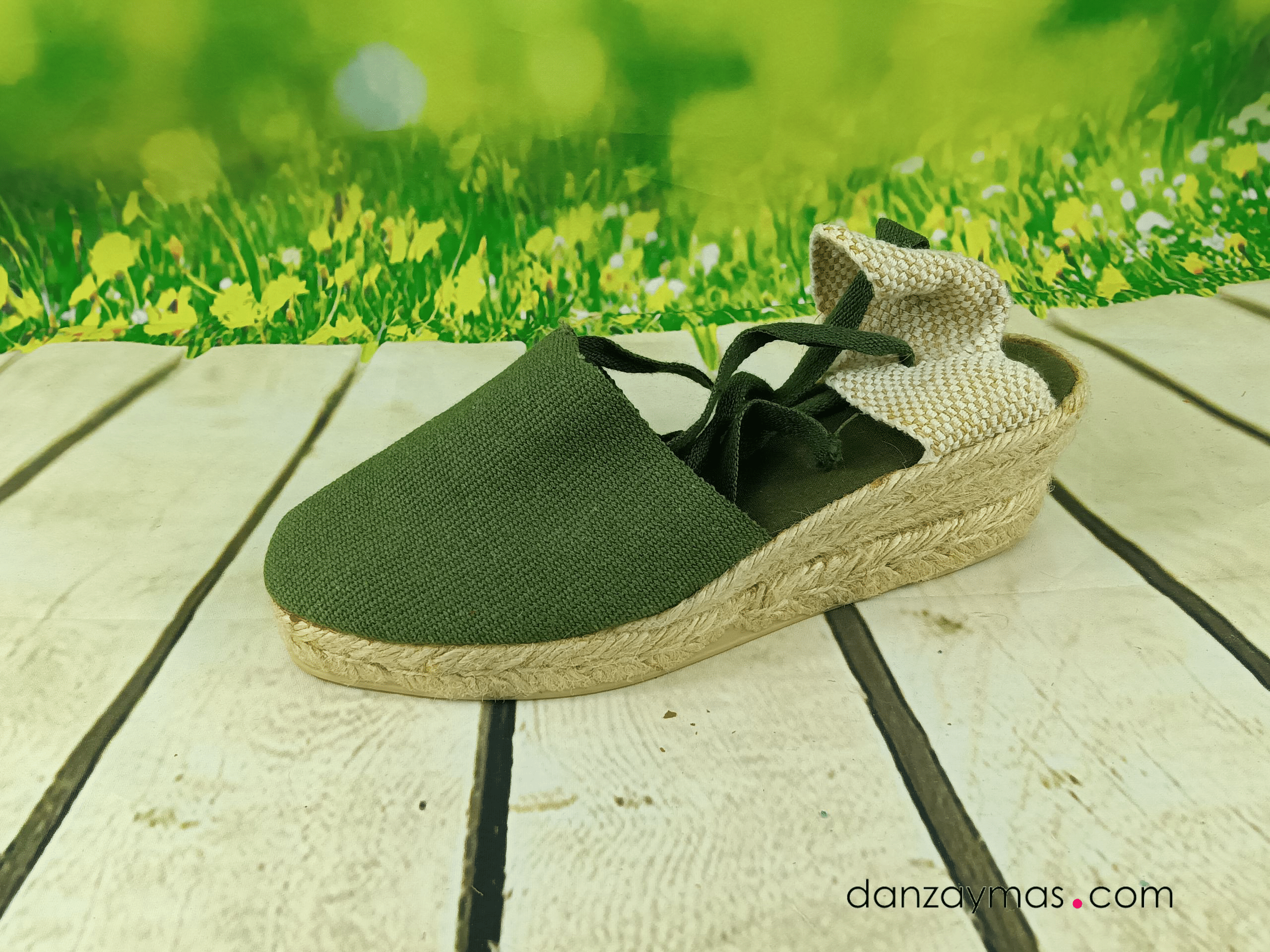 Esta confeccionada en tejido de loneta con es esparto en su suela y goma para que no se moje el esparto si llueve. La cinta del mismo color la llega cogida de una anilla de tejido que cosen al empeine.