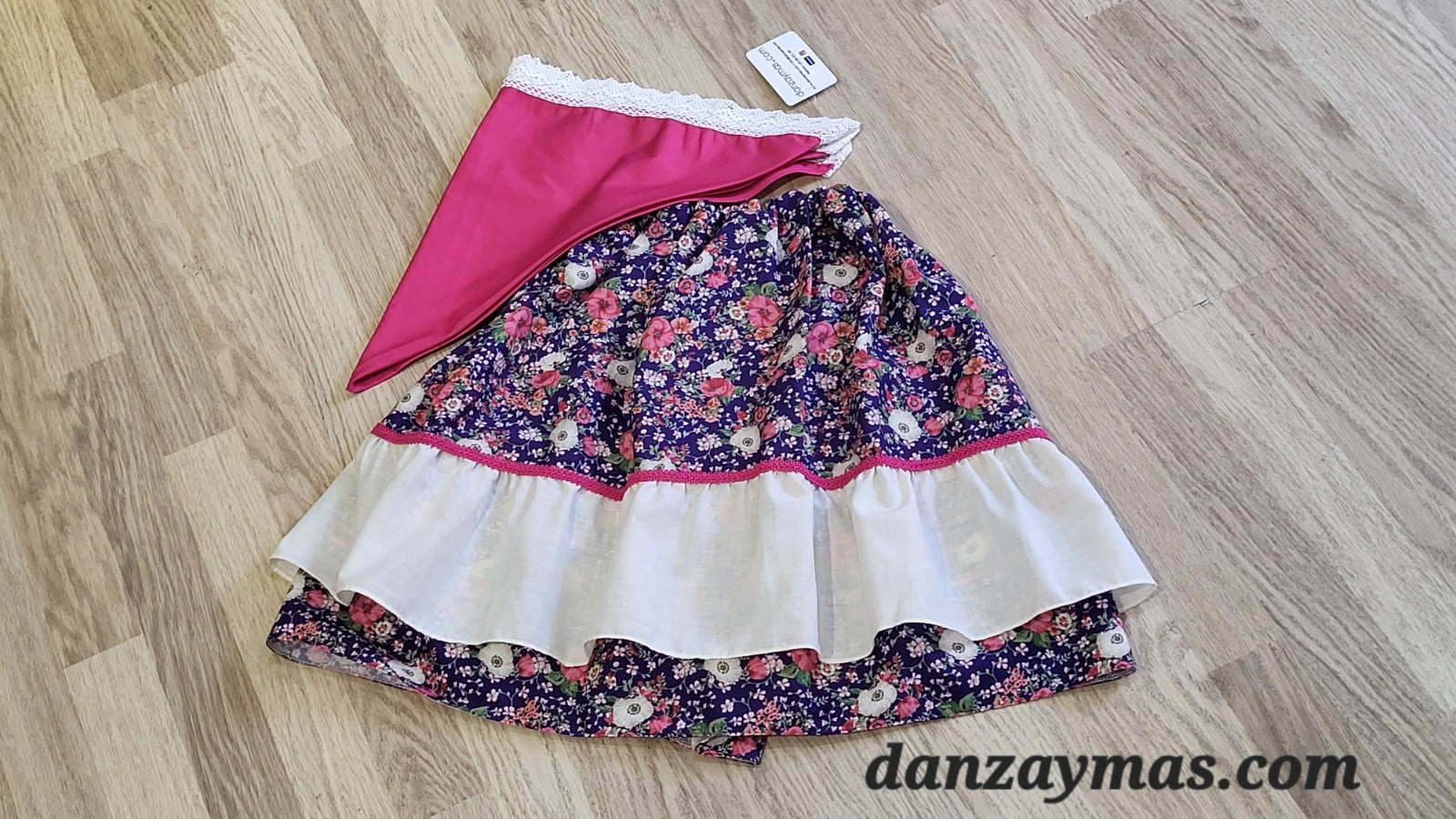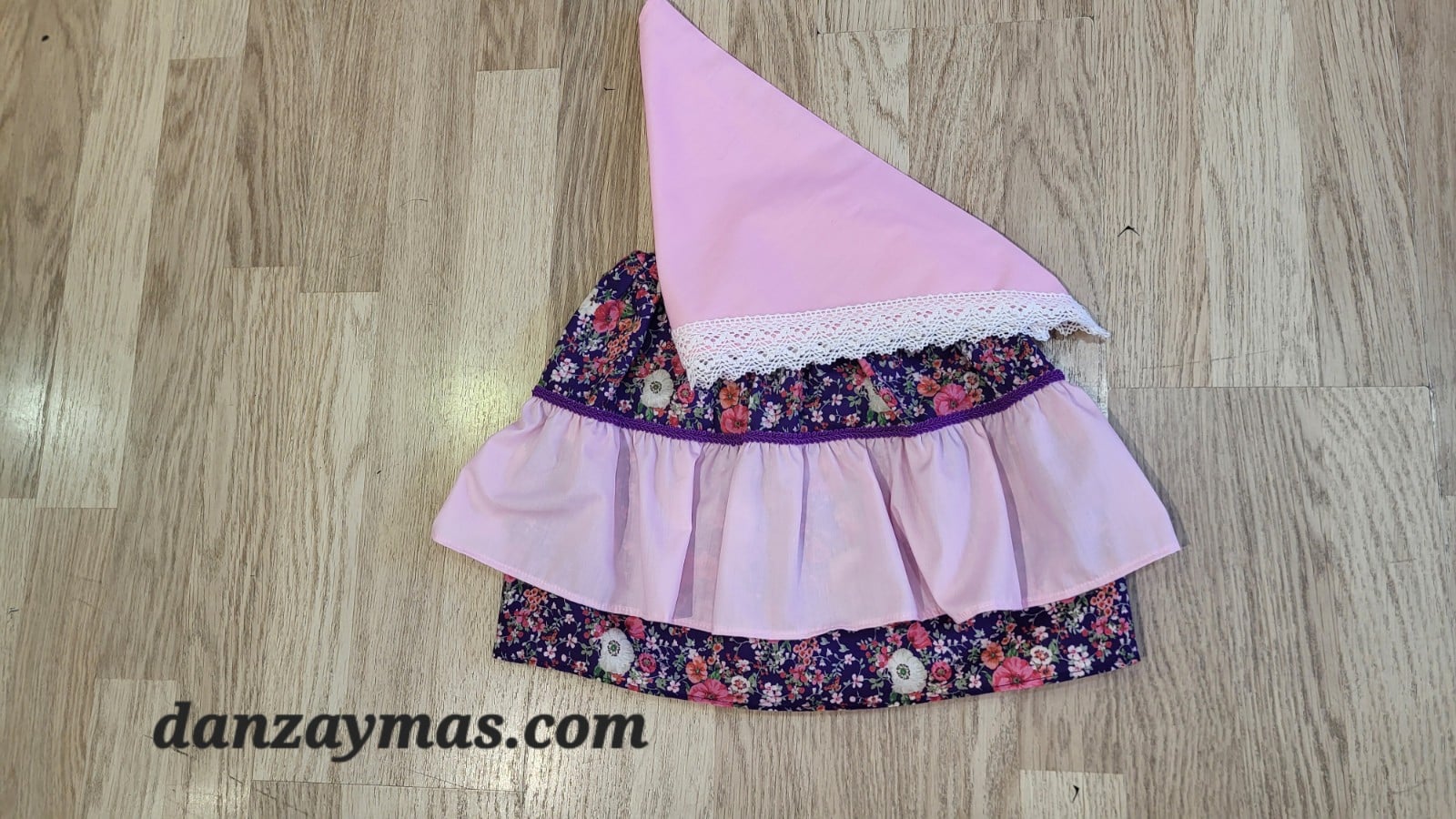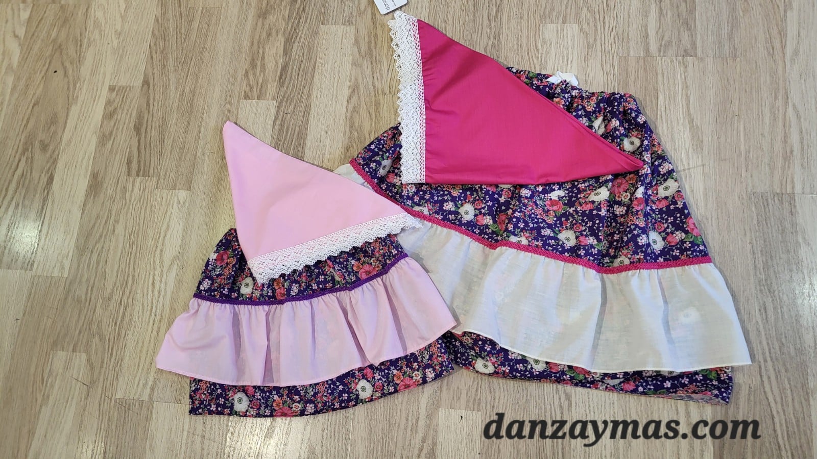Zagalejo niña lilas. En color morado intenso y un bonito volante en liso ambas tallas son de diferentes colores para que combines a tus niñas diferentes y parecidas a la vez. El cuerpo del zagalejo es de flores de diferentes colores rosados, beige y rosas. La pañoleta que va incluida en el precio es de color para que combine con el estampado del zagalejo. Un tapa costuras de color intenso o morado o fucsia termina de adornar el zagalejo de niña.