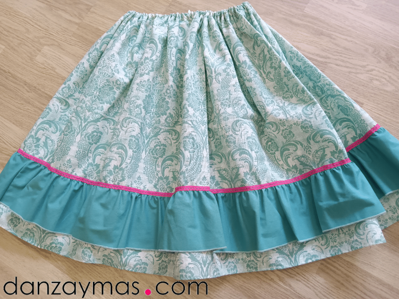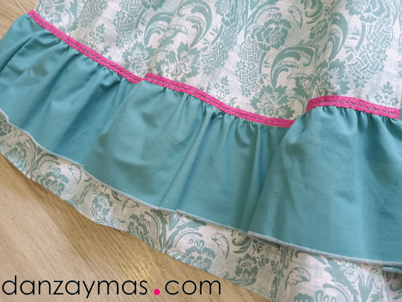 En color verde agua con flores raras y diferentes sobre fondo blanco roto. El volante en este caso lo cosemos en color verde agua para que haga armonía. Va rematado con una puntilla color fucsia que termina de adornar el conjunto.