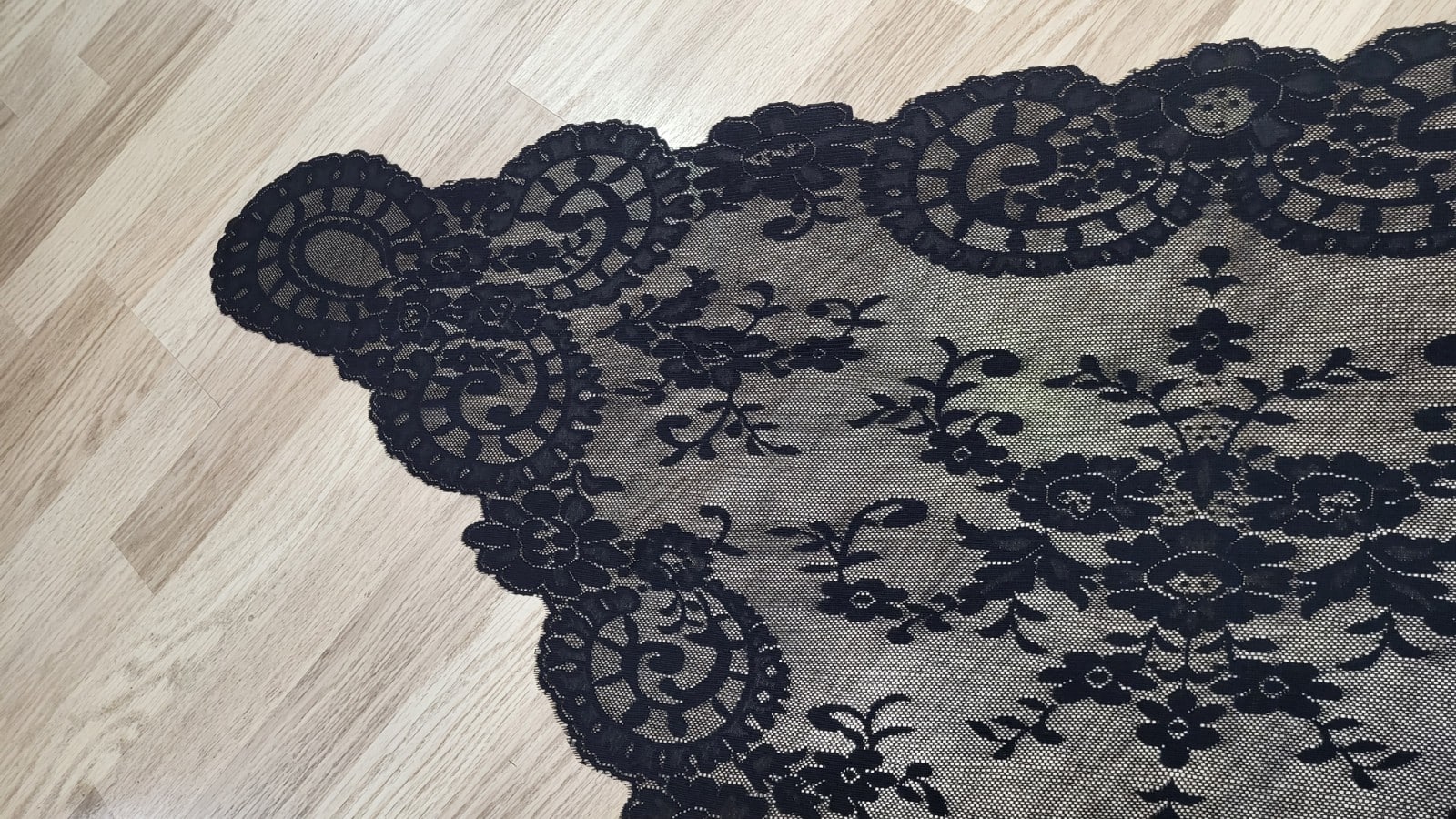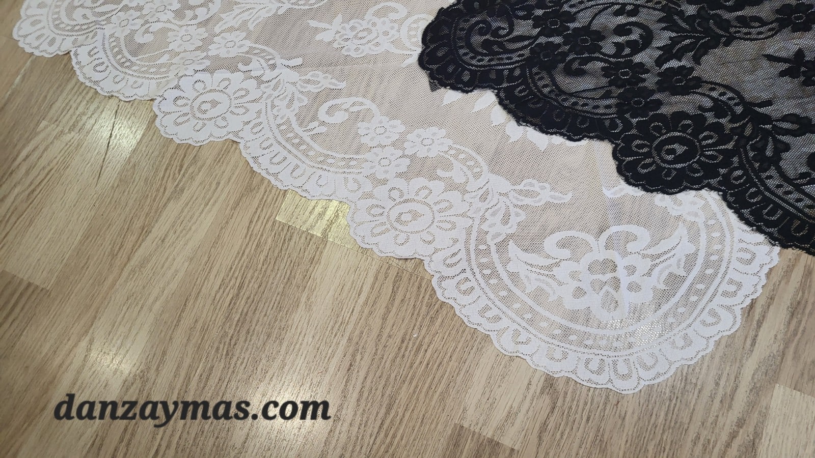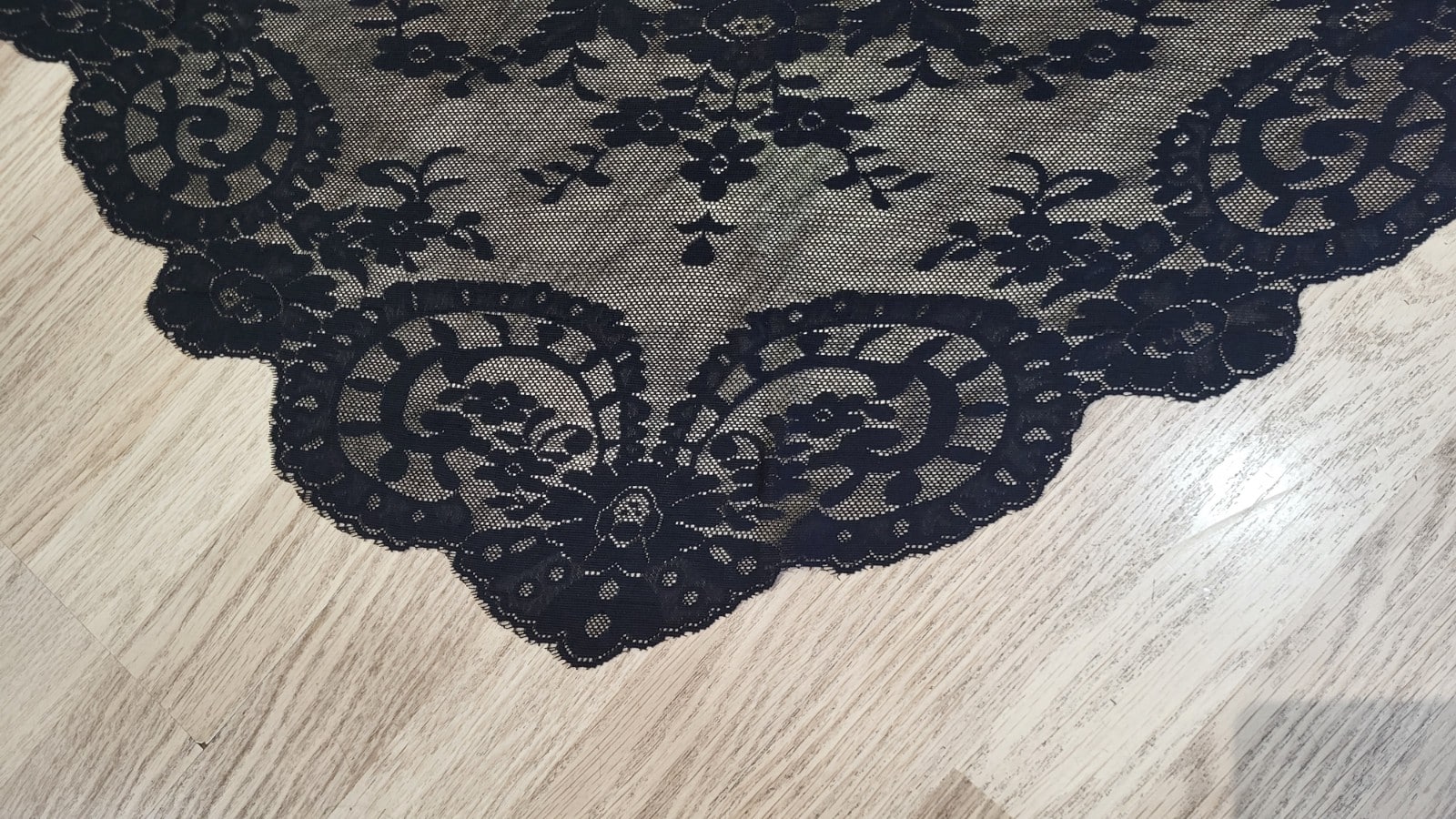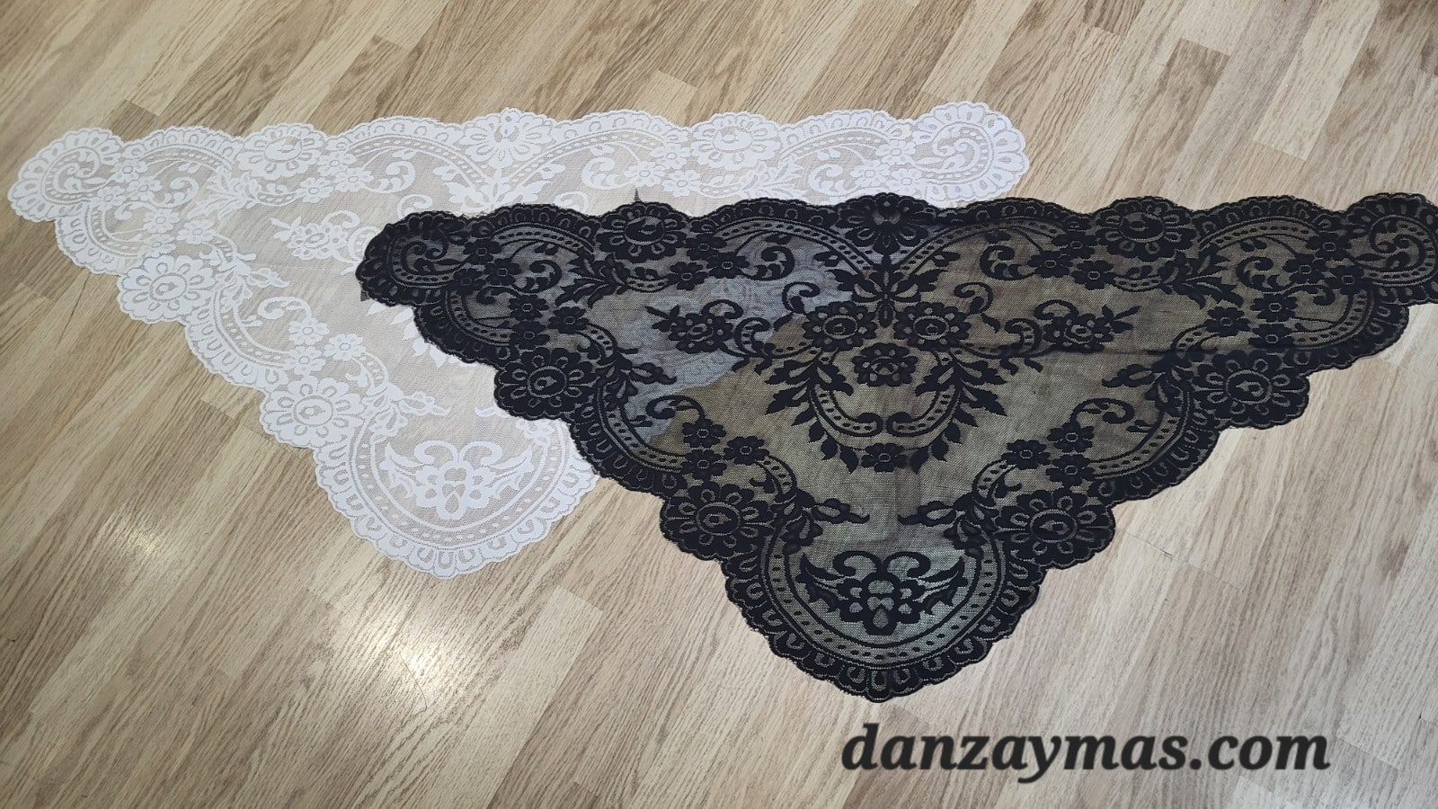 Velo para traje regional. Necesitas ocultar tu cabeza para ir a algún evento religioso y tradicional? Pues aquí tienes el autentico velo para iglesias cortito y con forma de triangulo que cubrirá tu cabello en cualquier acto religioso. Esta confeccionado en blonda de color negro de tres puntas y decorado con tul y rosas.