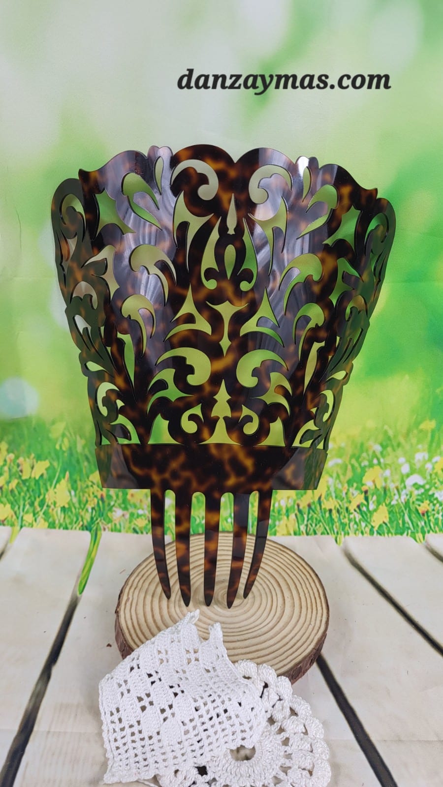 Teja para manola de concha. Esta teja para semana santa o fiestas patronales es de tamaño mediano para quien no quiera destacar demasiado. Con un preciosos dibujo perforado haciendo ondas en toda la teja e incluso en el borde de la misma. Decimos que es de concha por su color porque es de plástico.